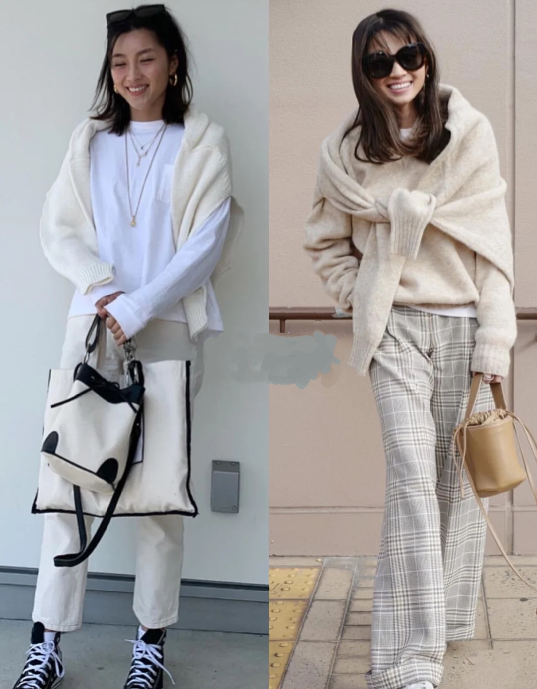 米色针织坎肩叠穿白色长袖T恤,坎肩色系呼应休闲直筒裤,减龄又时尚;米灰色针织坎肩叠穿同色针织衫,造型立刻与众不同。